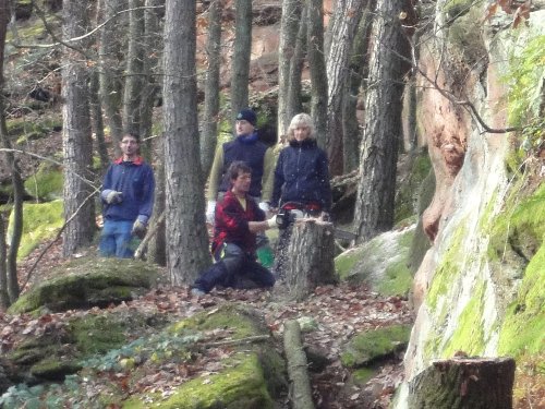 Am 24.11. hat die Arbeitsgruppe SanSi unter der Leitung des PK-Felswartes nach Rücksprache mit den Waldbesitzern, dem Forst und der zustaendigen Narurschutzbehoerde an den Hülsenfelsen felsnahe Bäume gefällt. Mit dabei waren auch Mitglieder vom DAV-KL die den Zustiegsweg zum Fels frisch angelegt haben. Zusätzlich wurden auf dem Band unter dem Bohnenturm, wo notwendig, die Standplätze gesichert. Alles in allem waren mehr als 15 Helfer von 9.30 bis 17.00 im Einsatz.